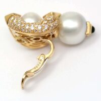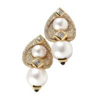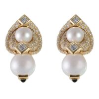 Paire de boucles d’oreilles en or jaune, perles blanches de 14,7mm de diamètre, deux diamants taille princesse carrée et taille brillant, petit cabochon de rubis, signé, numéro A1226, hauteur 4cm, avec écrin de la marque (42,75grs)